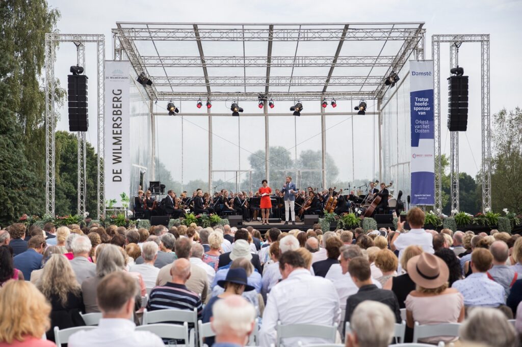 The Flat Roof system is a one-sided sloping canopy of which the roof grid is built from 40×40 trusses supported by 4 30×30 mast trusses. Two extra support masts are placed at the rear, increasing the rigging capacity in the rear of the roof, for example for an LED screen. The Flat Roof system is available with black or transparent tarpaulins. In addition, it is possible to build a covered Sidestage on both sides and/or a covered backstage area at the rear.